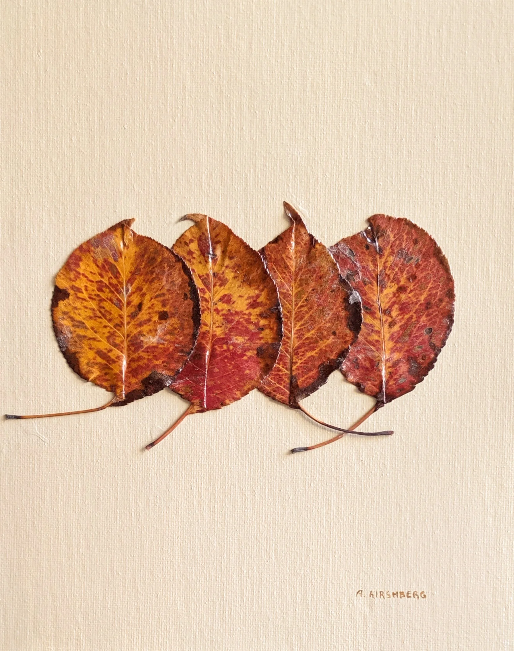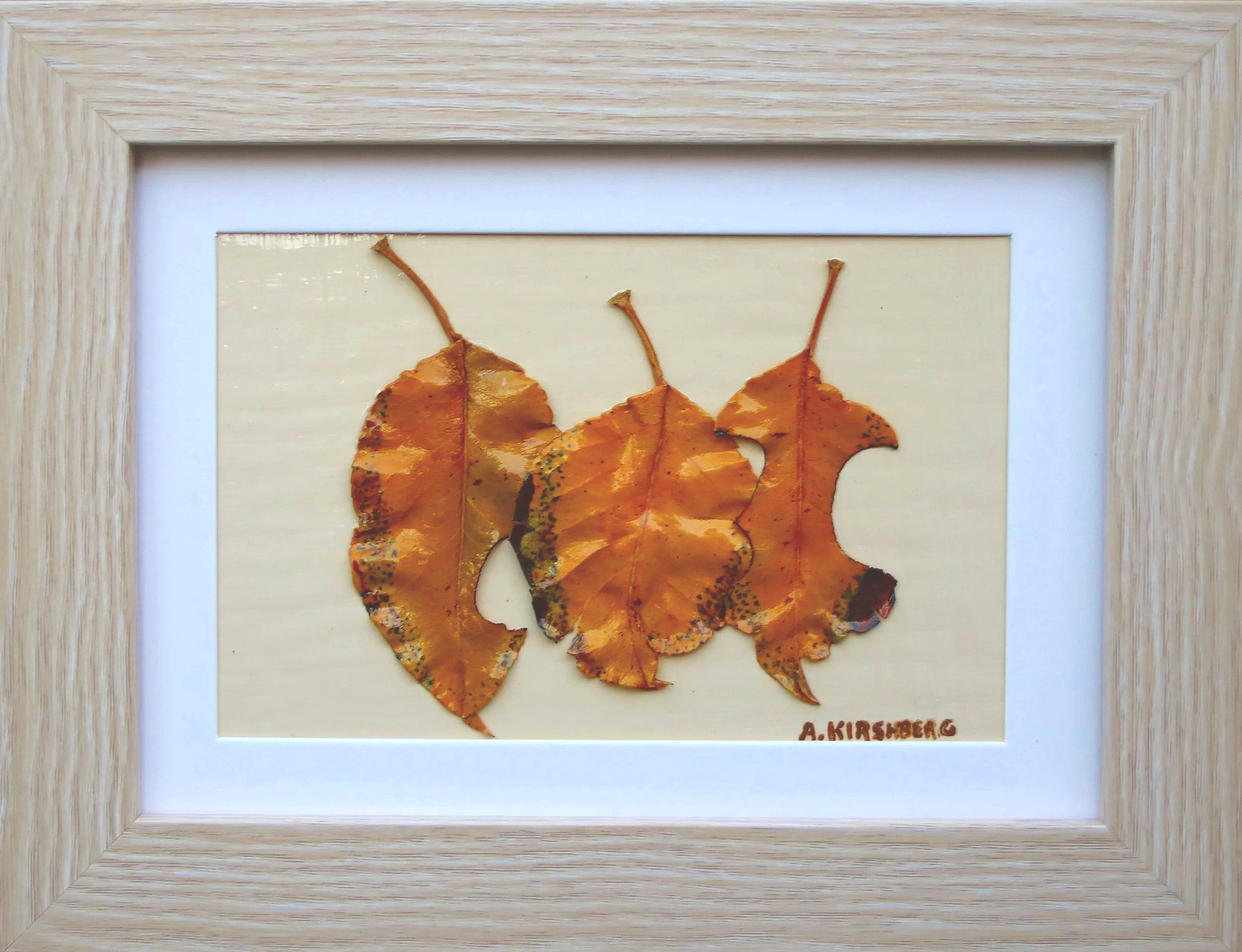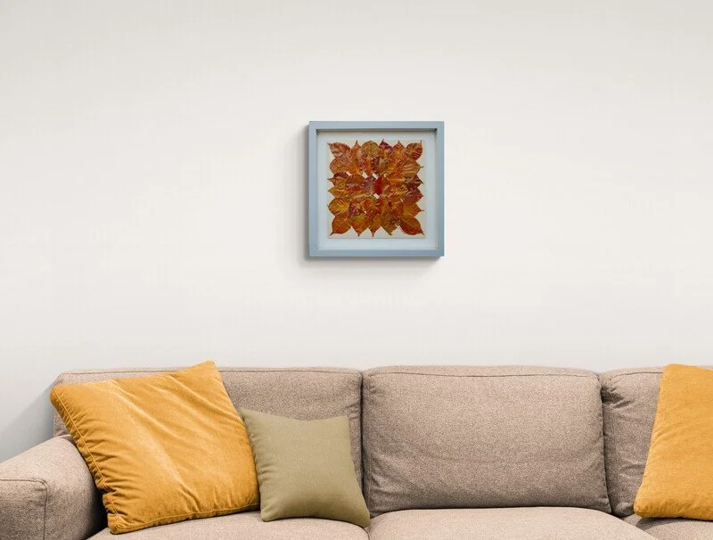 Leaves of the "Flowering Pear Tree." Collected in the greater Phoenix area during the Fall and Winter. Cured and mounted on a custom panel with an almond finish. Beautiful black frame with a double mat. I frame most of my art myself. The back of the frame is unique, featuring a creative design.