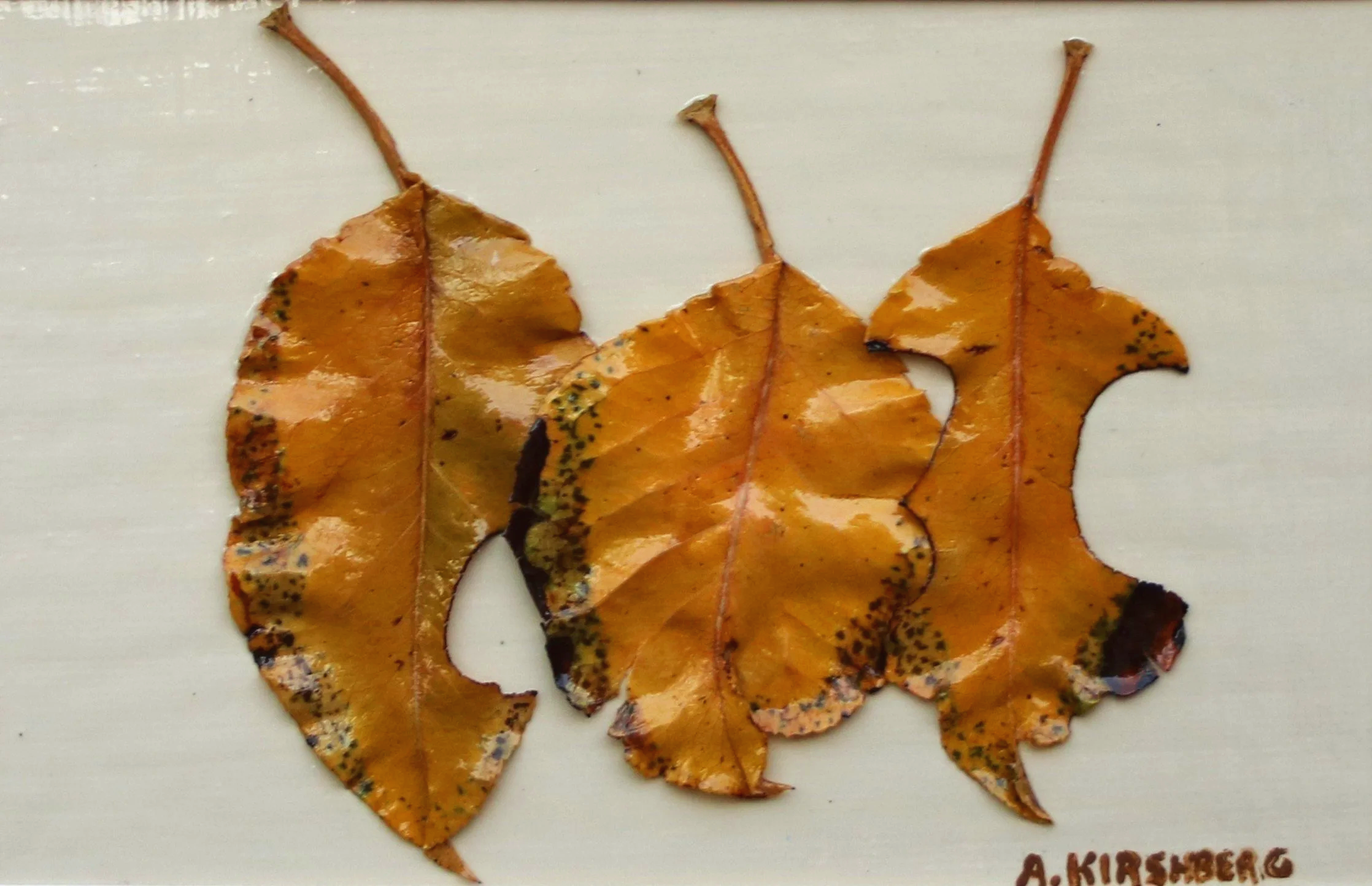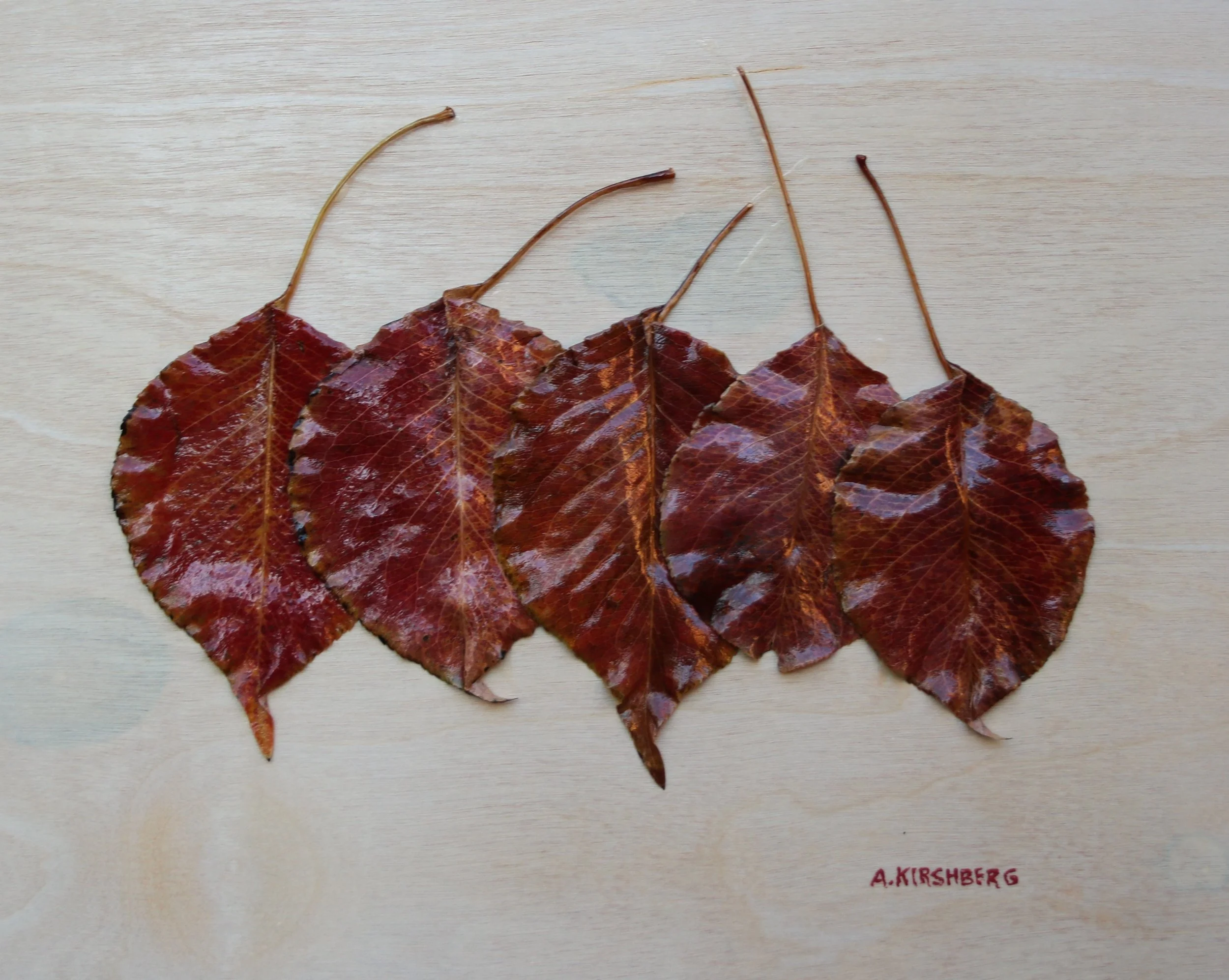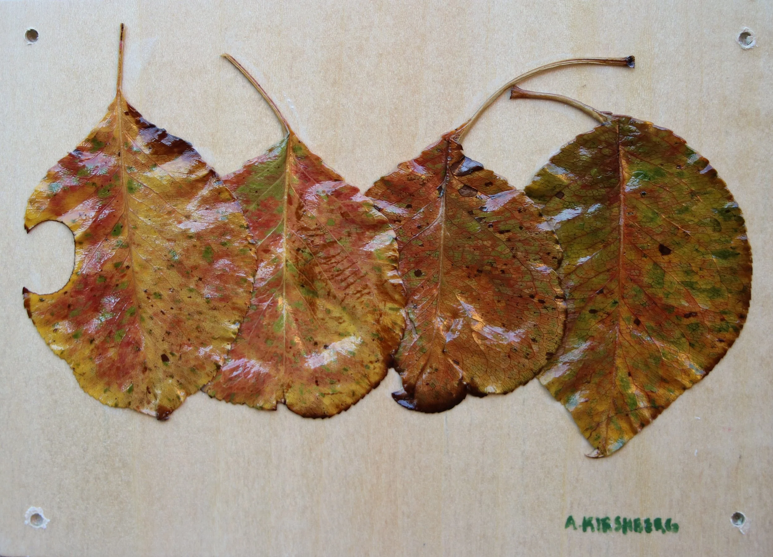 Leaves of the "Flowering Pear Tree." Collected in the greater Phoenix area during the Fall and Winter. Cured and mounted on a custom panel with an almond finish. Beautiful black frame with a double mat. I frame most of my art myself. The back of the frame is unique, featuring a creative design.
